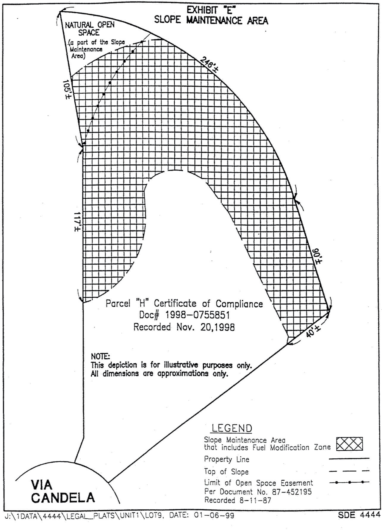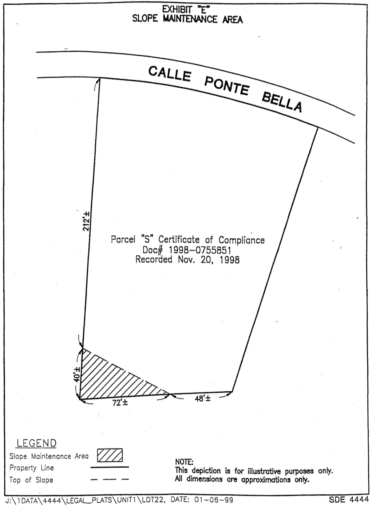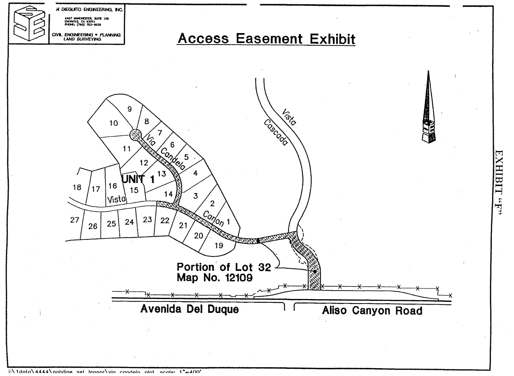 LEGAL DESCRIPTION PARCEL "D" B/C 98-0164 LOT 5 OF COUNTYOFSANDIEGOTRACTNO.4569-01, in THE COUNTY OF SAN DIEGO, STATE OF CALIFORNIA, ACCORDING TO MAPTHEREOF, NO. 12109, FILED in THE OFFICE OF THE COUNTY RECORDER OF SAN DIEGO COUNTY, JULY 6, 1988, EXCEPTING THEREFROM THE SOUTHEASTERLY 3.00 FEET THEREOF, TOGETHER WITH THE SOUTHEASTERLY 3.00 FEET OF LOT 6 OF SAID MAP NO. 12109. LEGAL DESCRIPTION PARCEL "E" B/C 98-0164 LOT 6 OF COUNTY OF SAN DIEGO TRACT NO. 4569-01, in THE COUNTY OF SAN DIEGO, STATE OF CALIFORNIA, ACCORDING TO MAP THEREOF, NO. 12109, FILED in THE OFFICE OF THE COUNTY RECORDER OF SAN DIEGO COUNTY, JULY 6, 1988, EXCEPTING THEREFROM THE SOUTHEASTERLY 3.00 FEET THEREOF, TOGETHER WITH THE SOUTHEASTERLY 3.00 FEET OF LOT 7 OF SAID MAP NO. 12109. LEGAL DESCRIPTION PARCEL "F" B/C 98-0164 LOT7OFCOUNTYOFSANDIEGOTRACTNO.4569-01,NI THE COUNTYOF SANDIEGO,STATE OF CALIFORNIA, ACCORDING TO MAPTHEREOF, NO. 12109, FILED IN THE OFFICE OF THE COUNTY RECORDER OF SAN DIEGO COUNTY, JULY 6, 1988, EXCEPTING THEREFROM THE SOUTHEASTERLY 3.00 FEET THEREOF, TOGETHER WITH THE SOUTHEASTERLY 3.00 FEET OF LOT 8 OF SAID MAP NO. 12109. LEGAL DESCRIPTION PARCEL "G" B/C 98-0164 LOT 8 OF COUNTY OF SAN DIEGO TRACT NO. 4569-01, in THE COUNTY OF SAN DIEGO, STATE OF CALIFORNIA, ACCORDING TO MAP THEREOF, NO. 12109, FILED in THE OFFICE OF THE COUNTY RECORDER OF SAN DIEGO COUNTY, JULY 6, 1988, EXCEPTINGTHEREFROM THE SOUTHEASTERLY 3.00 FEET THEREOF, TOGETHER WITH THE EASTERLY 3.00 FEET OF LOT 9 OF SAID MAP NO. 12109. LEGAL DESCRIPTION PARCEL "H" B/C 98-0164 L O T 9 OF C O U N T Y O F S A N D I E G O T R A C T N O . 4 5 6 9 - 0 1 , in THE C O U N T Y O F S A N D I E G O , S T A T E O F C A L I F O R N I A , A C C O R D I N G T O M A P T H E R E O F , N O . 1 2 1 0 9 , F I L E D in T H E O F F I C E O F T H E COUNTY RECORDER OF SAN DIEGO COUNTY, JULY 6, 1988, EXCEPTING THEREFROM THE EASTERLY 3.00 FEET THEREOF, ALSO EXCEPTING THEREFROM THAT PORTION LYING SOUTHWESTERLY OF THE FOLLOWING DESCRIBED LINES: BEGINNING AT THE SOUTHWESTERLY CORNER OF SAID LOT 9, BEING APOINT THE ARC OF A 48.00 FOOT RADIUS CURVE CONCAVE SOUTHEASTERLY, ARADIAL LINE THROUGH SAID POINT BEARS SOUTH 39°02'38* EAST; THENCE NORTHEASTERLY ALONG THE ARC OF SAIDCURVE 10.79 FEET THROUGH ACENTRAL ANGLE OF 12°52'56", SAID POINT BEING THE TRUE POINT OF BEGINNING;THENCELEAVINGSAIDLINENORTH 18°10'46* WEST, 20.49 FEET; THENCE NORTH 39°02°38*WEST, 218.88FEET: THENCE NORTH 48°48'29" WEST, 106.13 FEET TO THE MOST WESTERLY CORNER OF SAIDLOT 9. LEGAL DESCRIPTION PARCEL"!' B/C 98-0164 LOT 1 OF COUNTY OF SAN DIEGO TRACT NO. 4569-01, in THE COUNTY OF SAN DIEGO, STATE OF CALIFORNIA, ACCORDING TOMAP THEREOF,NO. 12109, FILED in THE OFFICE OF THE COUNTY RECORDER OF SAN DIEGO COUNTY, JULY 6, 1988, TOGETHER WITH THE NORTHWESTERLY 39.00 FEET OF LOT 12 OF SAID MAP NO. 12109, ALSOTOGETHERWITH THAT PORTION OFLOT 16 OF SAID MAP NO. 12109 LYING NORTHEASTERLY OF THE FOLLOWING DESCRIBED LINES: BEGINNINGATTHESOUTHWESTERLY TERMINUSOF THE SOUTHEASTERLYLINEOF SAID NORTHWESTERLY 39.00 FEET OF LOT 12; THENCE ALONG THE SOUTHWESTERLY PROLONGATION THEREOFSOUTH 44°28'25*WEST,3.59 FEET TO ALINE RUNNING PARALLEL WITH AND DISTANT 3.00 FEET SOUTHWESTERLY FROM THE NORTHEASTERLY LINE OF SAID LOT16; THENCEALONG SAID LINENORTH 12°19'39" WEST, 48.32 FEET OT THE NORTHWESTERLYLINE OF SAIDLOT16;THENCEALONG SAIDLINE NORTH 72°52'59* EAST, 3.01 FEET TO THE MOST NORTHERLY CORNER OF SAID LOT 16. LEGAL DESCRIPTION PARCEL "J" B/C 98-0164 LOT 12 OF COUNTY OF SAN DIEGO TRACT NO. 4569-01, in THE COUNTY OF SAN DIEGO, STATE OF CALIFORNIA, ACCORDING TO MAP THEREOF, NO. 12109, FILED in THE OFFICE OF THE COUNTY RECORDER OF SAN DIEGOCOUNTY, JULY 6, 1988, EXCEPTING THEREFROM THE NORTHWESTERLY 39.00 FEET THEREOF, TOGETHER WITH THE NORTHWESTERLY 55.00 FEET OF LOT 13 OF SAID MAP NO. 12109, ALSO TOGETHERWITH THATPORTION OFLOT15OFSAID MAP NO. 12109 LYING NORTHEASTERLY OF THE FOLLOWING DESCRIBED LINES: G-4 BEGINNING AT THE SOUTHWESTERLY TERMINUS OF THE SOUTHEASTERLYLINE O F SAID NORTHWESTERLY 55.00 FEET OF LOT 13; THENCE ALONG THE SOUTHWESTERLY PROLONGATIONTHEREOF SOUTH46°03'53"WEST,3.08FEETTOALINERUNNINGPARALLEL WITH AND DISTANT 3.00 FEET SOUTHWESTERLY FROM THE NORTHEASTERLY LINE OF SAID LOT 15; THENCE ALONG SAID LINENORTH30°57'50" WEST, 58.16 FEET TOTHE NORTHWESTERLY LINE OF SAID LOT 15; THENCE ALONG SAID LINE NORTH 77°58'19" EAST, 3.17 FEET TO THE MOST NORTHERLYCORNER OF SAID LOT15. ALSO TOGETHER WITH THAT PORTION OF LOT 16 OF SAID MAP NO. 12109 LYING NORTHEASTERLYOF THE FOLLOWINGDESCRIBED LINES: BEGINNING AT THE SOUTHWESTERLY TERMINUS OF THE SOUTHEASTERLY LINE OF SAID NORTHWESTERLY 39.00 FEET OF LOT 12; THENCE ALONG THE SOUTHWESTERLY PROLONGATION THEREOF SOUTH 44°28'25" WEST, 3.59 FEETTO ALINE RUNNING PARALLEL WITH AND DISTANT 3.00 FEET SOUTHWESTERLY FROM THE NORTHEASTERLYLINE OF SAID LOT16; THENCE ALONG SAID LINESOUTH 12°19'39"EAST, 45.35 FEETTO THE SOUTHWESTERLY PROLONGATION OF THE SOUTHEASTERLY LINE OF SAID LOT 12; THENCE ALONGSAID LNIE NORTH 77°58'19" EAST, 3.00 FET OT THE MOSTSOUTHERLY CORNER OF SAID LOT 12. LEGAL DESCRIPTION PARCEL "K" B/C 98-0164 LOT 13 OF COUNTY OF SAN DIEGO TRACT NO. 4569-01, IN THE COUNTY OF SAN DIEGO, STATE OF CALIFORNIA, ACCORDING TO MAP THEREOF, NO. 12109, FILED in THE OFFICE OF THE COUNTY RECORDER OF SAN DIEGO COUNTY, JULY 6, 1988, EXCEPTING THEREFROM THE NORTHWESTERLY 55.00FEET THEREOF, TOGETHER WITH THE NORTHWESTERLY 55.00 FEET OF LOT 14 OF SAID MAP NO. 12109, ALSO TOGETHER WITH THATPORTION OF LOT 15 OF SAID MAP NO. 12109LYING NORTHEASTERLY OF THE FOLLOWING DESCRIBED LINES: BEGINNING AT THE SOUTHWESTERLY TERMINUS OF THE SOUTHEASTERLYLINE OF SAID NORTHWESTERLY 55.00 FEET OF LOT 14; THENCE ALONG THE SOUTHWESTERLY PROLONGATION THEREOF SOUTH67°11'18" WEST, 3.11 FEET TO ALINE RUNNING PARALLEL WITH ANDDISTANT 3.00 FEET SOUTHWESTERLY FROM THE NORTHEASTERLYLINE OF SAID LOT 15; THENCE ALONG SAID LINE NORTH 7°42'19" WEST, 57.16FEET ANDNORTH 30°57'50* WEST, 82.19 FEET TO THE SOUTHWESTERLY 