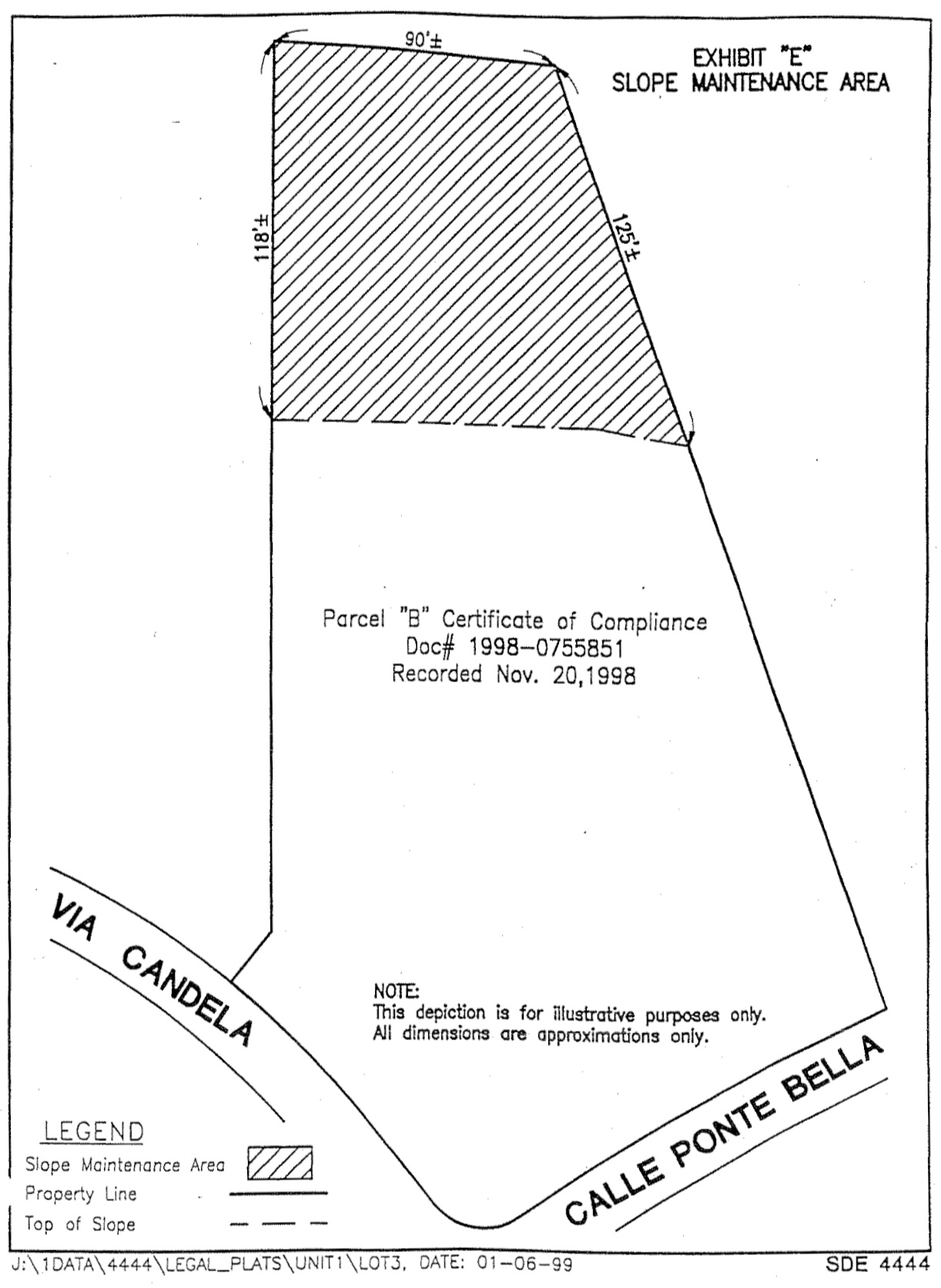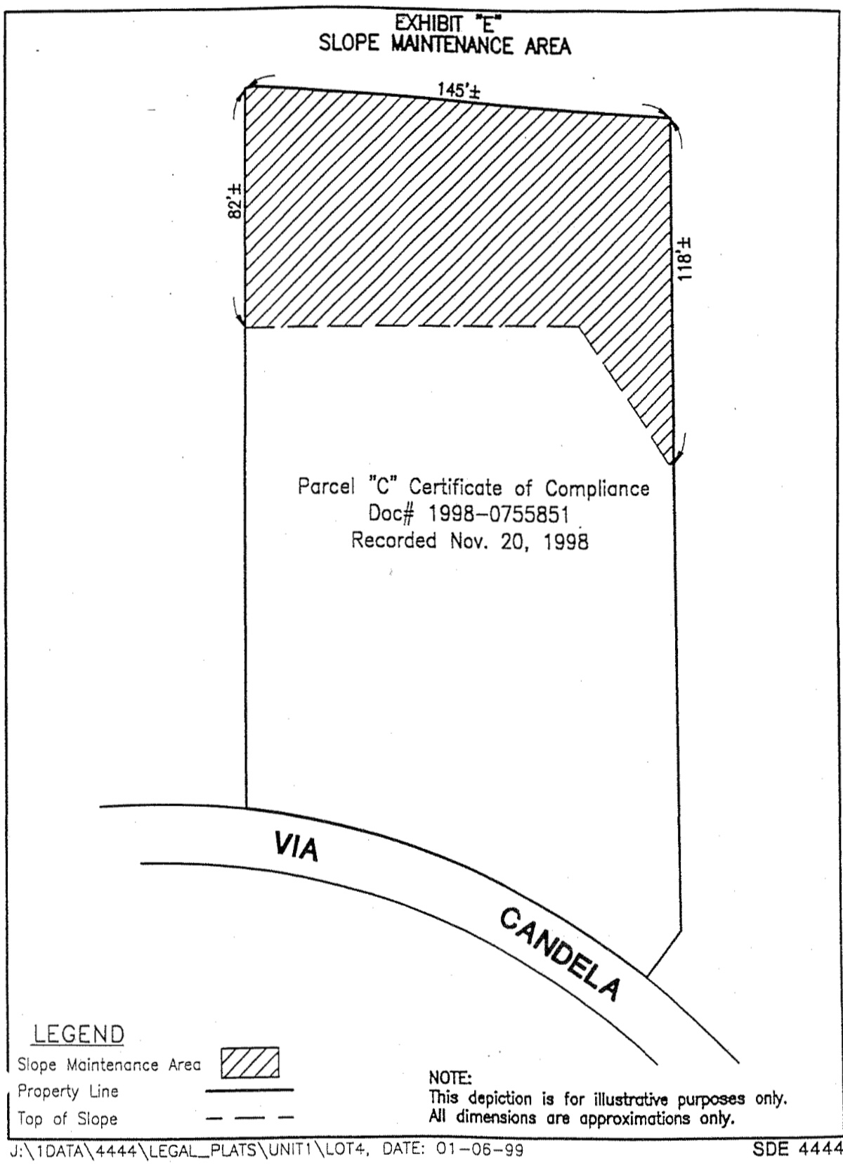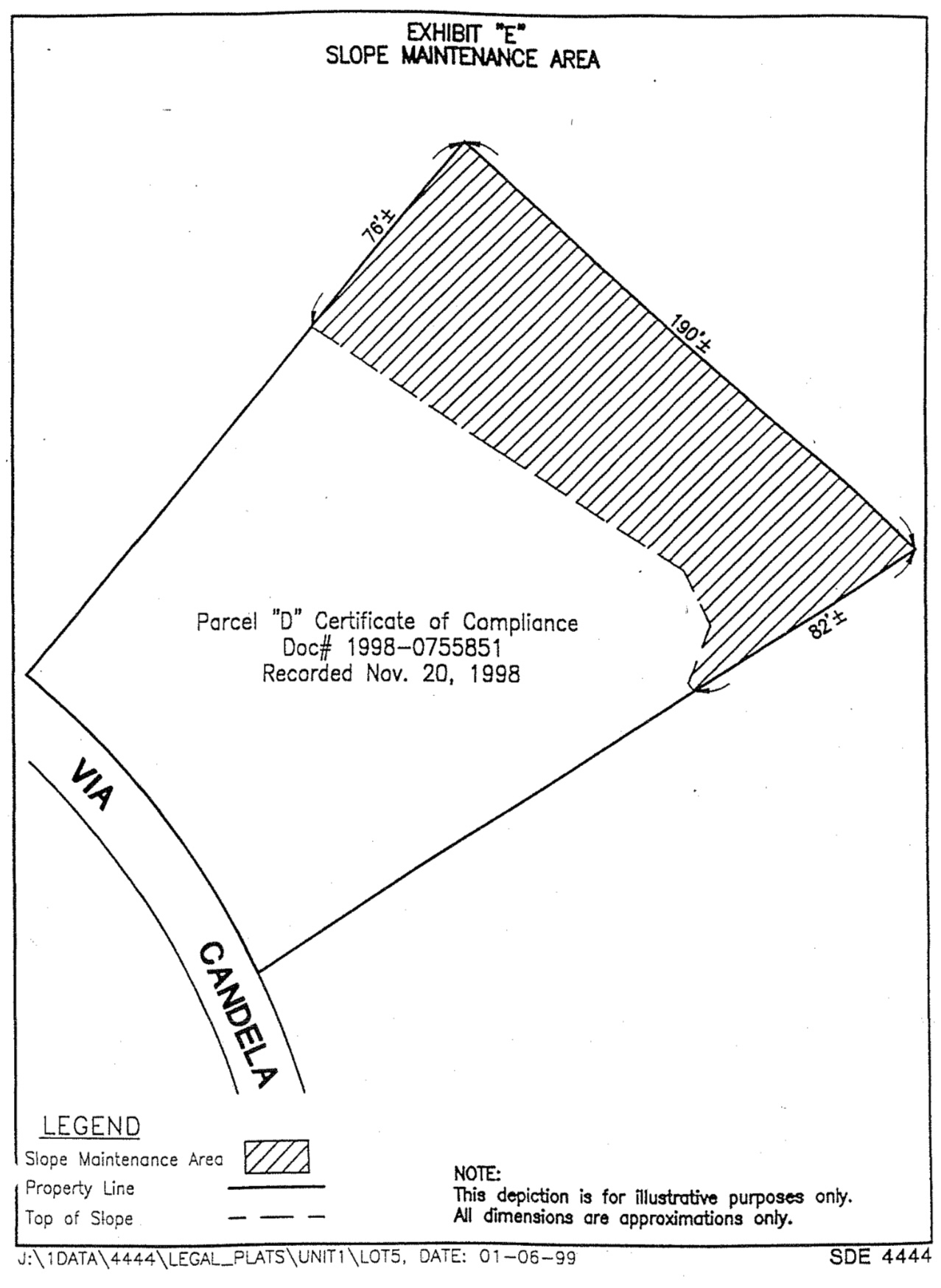 LEGAL DESCRIPTION PARCEL "D" B/C 98-0164 LOT 5 OF COUNTYOFSANDIEGOTRACTNO.4569-01, in THE COUNTY OF SAN DIEGO, STATE OF CALIFORNIA, ACCORDING TO MAPTHEREOF, NO. 12109, FILED in THE OFFICE OF THE COUNTY RECORDER OF SAN DIEGO COUNTY, JULY 6, 1988, EXCEPTING THEREFROM THE SOUTHEASTERLY 3.00 FEET THEREOF, TOGETHER WITH THE SOUTHEASTERLY 3.00 FEET OF LOT 6 OF SAID MAP NO. 12109. LEGAL DESCRIPTION PARCEL "E" B/C 98-0164 LOT 6 OF COUNTY OF SAN DIEGO TRACT NO. 4569-01, in THE COUNTY OF SAN DIEGO, STATE OF CALIFORNIA, ACCORDING TO MAP THEREOF, NO. 12109, FILED in THE OFFICE OF THE COUNTY RECORDER OF SAN DIEGO COUNTY, JULY 6, 1988, EXCEPTING THEREFROM THE SOUTHEASTERLY 3.00 FEET THEREOF, TOGETHER WITH THE SOUTHEASTERLY 3.00 FEET OF LOT 7 OF SAID MAP NO. 12109. LEGAL DESCRIPTION PARCEL "F" B/C 98-0164 LOT7OFCOUNTYOFSANDIEGOTRACTNO.4569-01,NI THE COUNTYOF SANDIEGO,STATE OF CALIFORNIA, ACCORDING TO MAPTHEREOF, NO. 12109, FILED IN THE OFFICE OF THE COUNTY RECORDER OF SAN DIEGO COUNTY, JULY 6, 1988, EXCEPTING THEREFROM THE SOUTHEASTERLY 3.00 FEET THEREOF, TOGETHER WITH THE SOUTHEASTERLY 3.00 FEET OF LOT 8 OF SAID MAP NO. 12109. LEGAL DESCRIPTION PARCEL "G" B/C 98-0164 LOT 8 OF COUNTY OF SAN DIEGO TRACT NO. 4569-01, in THE COUNTY OF SAN DIEGO, STATE OF CALIFORNIA, ACCORDING TO MAP THEREOF, NO. 12109, FILED in THE OFFICE OF THE COUNTY RECORDER OF SAN DIEGO COUNTY, JULY 6, 1988, EXCEPTINGTHEREFROM THE SOUTHEASTERLY 3.00 FEET THEREOF, TOGETHER WITH THE EASTERLY 3.00 FEET OF LOT 9 OF SAID MAP NO. 12109. LEGAL DESCRIPTION PARCEL "H" B/C 98-0164 L O T 9 OF C O U N T Y O F S A N D I E G O T R A C T N O . 4 5 6 9 - 0 1 , in THE C O U N T Y O F S A N D I E G O , S T A T E O F C A L I F O R N I A , A C C O R D I N G T O M A P T H E R E O F , N O . 1 2 1 0 9 , F I L E D in T H E O F F I C E O F T H E COUNTY RECORDER OF SAN DIEGO COUNTY, JULY 6, 1988, EXCEPTING THEREFROM THE EASTERLY 3.00 FEET THEREOF, ALSO EXCEPTING THEREFROM THAT PORTION LYING SOUTHWESTERLY OF THE FOLLOWING DESCRIBED LINES: BEGINNING AT THE SOUTHWESTERLY CORNER OF SAID LOT 9, BEING APOINT THE ARC OF A 48.00 FOOT RADIUS CURVE CONCAVE SOUTHEASTERLY, ARADIAL LINE THROUGH SAID POINT BEARS SOUTH 39°02'38* EAST; THENCE NORTHEASTERLY ALONG THE ARC OF SAIDCURVE 10.79 FEET THROUGH ACENTRAL ANGLE OF 12°52'56", SAID POINT BEING THE TRUE POINT OF BEGINNING;THENCELEAVINGSAIDLINENORTH 18°10'46* WEST, 20.49 FEET; THENCE NORTH 39°02°38*WEST, 218.88FEET: THENCE NORTH 48°48'29" WEST, 106.13 FEET TO THE MOST WESTERLY CORNER OF SAIDLOT 9. LEGAL DESCRIPTION PARCEL"!' B/C 98-0164 LOT 1 OF COUNTY OF SAN DIEGO TRACT NO. 4569-01, in THE COUNTY OF SAN DIEGO, STATE OF CALIFORNIA, ACCORDING TOMAP THEREOF,NO. 12109, FILED in THE OFFICE OF THE COUNTY RECORDER OF SAN DIEGO COUNTY, JULY 6, 1988, TOGETHER WITH THE NORTHWESTERLY 39.00 FEET OF LOT 12 OF SAID MAP NO. 12109, ALSOTOGETHERWITH THAT PORTION OFLOT 16 OF SAID MAP NO. 12109 LYING NORTHEASTERLY OF THE FOLLOWING DESCRIBED LINES: BEGINNINGATTHESOUTHWESTERLY TERMINUSOF THE SOUTHEASTERLYLINEOF SAID NORTHWESTERLY 39.00 FEET OF LOT 12; THENCE ALONG THE SOUTHWESTERLY PROLONGATION THEREOFSOUTH 44°28'25*WEST,3.59 FEET TO ALINE RUNNING PARALLEL WITH AND DISTANT 3.00 FEET SOUTHWESTERLY FROM THE NORTHEASTERLY LINE OF SAID LOT16; THENCEALONG SAID LINENORTH 12°19'39" WEST, 48.32 FEET OT THE NORTHWESTERLYLINE OF SAIDLOT16;THENCEALONG SAIDLINE NORTH 72°52'59* EAST, 3.01 FEET TO THE MOST NORTHERLY CORNER OF SAID LOT 16. LEGAL DESCRIPTION PARCEL "J" B/C 98-0164 LOT 12 OF COUNTY OF SAN DIEGO TRACT NO. 4569-01, in THE COUNTY OF SAN DIEGO, STATE OF CALIFORNIA, ACCORDING TO MAP THEREOF, NO. 12109, FILED in THE OFFICE OF THE COUNTY RECORDER OF SAN DIEGOCOUNTY, JULY 6, 1988, EXCEPTING THEREFROM THE NORTHWESTERLY 39.00 FEET THEREOF, TOGETHER WITH THE NORTHWESTERLY 55.00 FEET OF LOT 13 OF SAID MAP NO. 12109, ALSO TOGETHERWITH THATPORTION OFLOT15OFSAID MAP NO. 12109 LYING NORTHEASTERLY OF THE FOLLOWING DESCRIBED LINES: G-4 BEGINNING AT THE SOUTHWESTERLY TERMINUS OF THE SOUTHEASTERLYLINE O F SAID NORTHWESTERLY 55.00 FEET OF LOT 13; THENCE ALONG THE SOUTHWESTERLY PROLONGATIONTHEREOF SOUTH46°03'53"WEST,3.08FEETTOALINERUNNINGPARALLEL WITH AND DISTANT 3.00 FEET SOUTHWESTERLY FROM THE NORTHEASTERLY LINE OF SAID LOT 15; THENCE ALONG SAID LINENORTH30°57'50" WEST, 58.16 FEET TOTHE NORTHWESTERLY LINE OF SAID LOT 15; THENCE ALONG SAID LINE NORTH 77°58'19" EAST, 3.17 FEET TO THE MOST NORTHERLYCORNER OF SAID LOT15. ALSO TOGETHER WITH THAT PORTION OF LOT 16 OF SAID MAP NO. 12109 LYING NORTHEASTERLYOF THE FOLLOWINGDESCRIBED LINES: BEGINNING AT THE SOUTHWESTERLY TERMINUS OF THE SOUTHEASTERLY LINE OF SAID NORTHWESTERLY 39.00 FEET OF LOT 12; THENCE ALONG THE SOUTHWESTERLY PROLONGATION THEREOF SOUTH 44°28'25" WEST, 3.59 FEETTO ALINE RUNNING PARALLEL WITH AND DISTANT 3.00 FEET SOUTHWESTERLY FROM THE NORTHEASTERLYLINE OF SAID LOT16; THENCE ALONG SAID LINESOUTH 12°19'39"EAST, 45.35 FEETTO THE SOUTHWESTERLY PROLONGATION OF THE SOUTHEASTERLY LINE OF SAID LOT 12; THENCE ALONGSAID LNIE NORTH 77°58'19" EAST, 3.00 FET OT THE MOSTSOUTHERLY CORNER OF SAID LOT 12. LEGAL DESCRIPTION PARCEL "K" B/C 98-0164 LOT 13 OF COUNTY OF SAN DIEGO TRACT NO. 4569-01, IN THE COUNTY OF SAN DIEGO, STATE OF CALIFORNIA, ACCORDING TO MAP THEREOF, NO. 12109, FILED in THE OFFICE OF THE COUNTY RECORDER OF SAN DIEGO COUNTY, JULY 6, 1988, EXCEPTING THEREFROM THE NORTHWESTERLY 55.00FEET THEREOF, TOGETHER WITH THE NORTHWESTERLY 55.00 FEET OF LOT 14 OF SAID MAP NO. 12109, ALSO TOGETHER WITH THATPORTION OF LOT 15 OF SAID MAP NO. 12109LYING NORTHEASTERLY OF THE FOLLOWING DESCRIBED LINES: BEGINNING AT THE SOUTHWESTERLY TERMINUS OF THE SOUTHEASTERLYLINE OF SAID NORTHWESTERLY 55.00 FEET OF LOT 14; THENCE ALONG THE SOUTHWESTERLY PROLONGATION THEREOF SOUTH67°11'18" WEST, 3.11 FEET TO ALINE RUNNING PARALLEL WITH ANDDISTANT 3.00 FEET SOUTHWESTERLY FROM THE NORTHEASTERLYLINE OF SAID LOT 15; THENCE ALONG SAID LINE NORTH 7°42'19" WEST, 57.16FEET ANDNORTH 30°57'50* WEST, 82.19 FEET TO THE SOUTHWESTERLY 