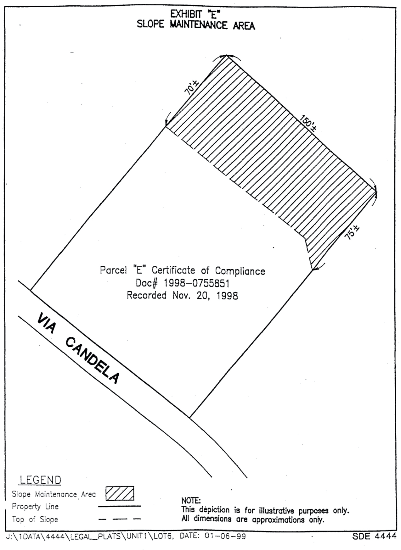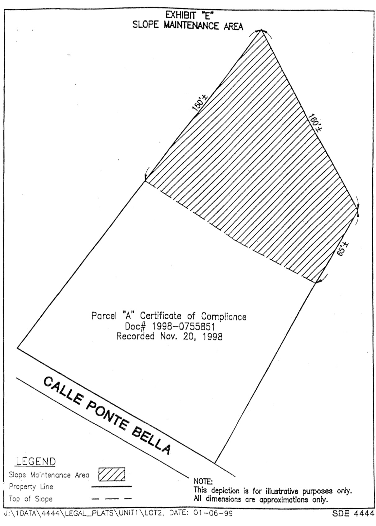 Slope Maintenance Areas means those portions of certain Lots within the Properties, the approximate location of which is shown on Exhibit "B" attached to this Agreement. Slope Maintenance Areas within Phase I are described in Exhibit "E" attached to the Master Declaration, and any Slope Maintenance Areas within subsequent Phases of the Properties will be described in a Notice of Addition. All Slope Maintenance Areas described in the Master Declaration and any Notice of Addition shall be subject to this Agreement. If there is any discrepancy between the information contained within said Exhibits and the actual as-built conditions of the Slope Maintenance Areas, the as-built conditions will control.
